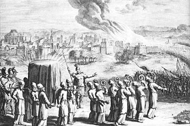 The covered ark with golden staves carried by the priests, and seven priests with rams’ horns, at the Battle of Jericho, in an eighteenth-century artist’s depiction.