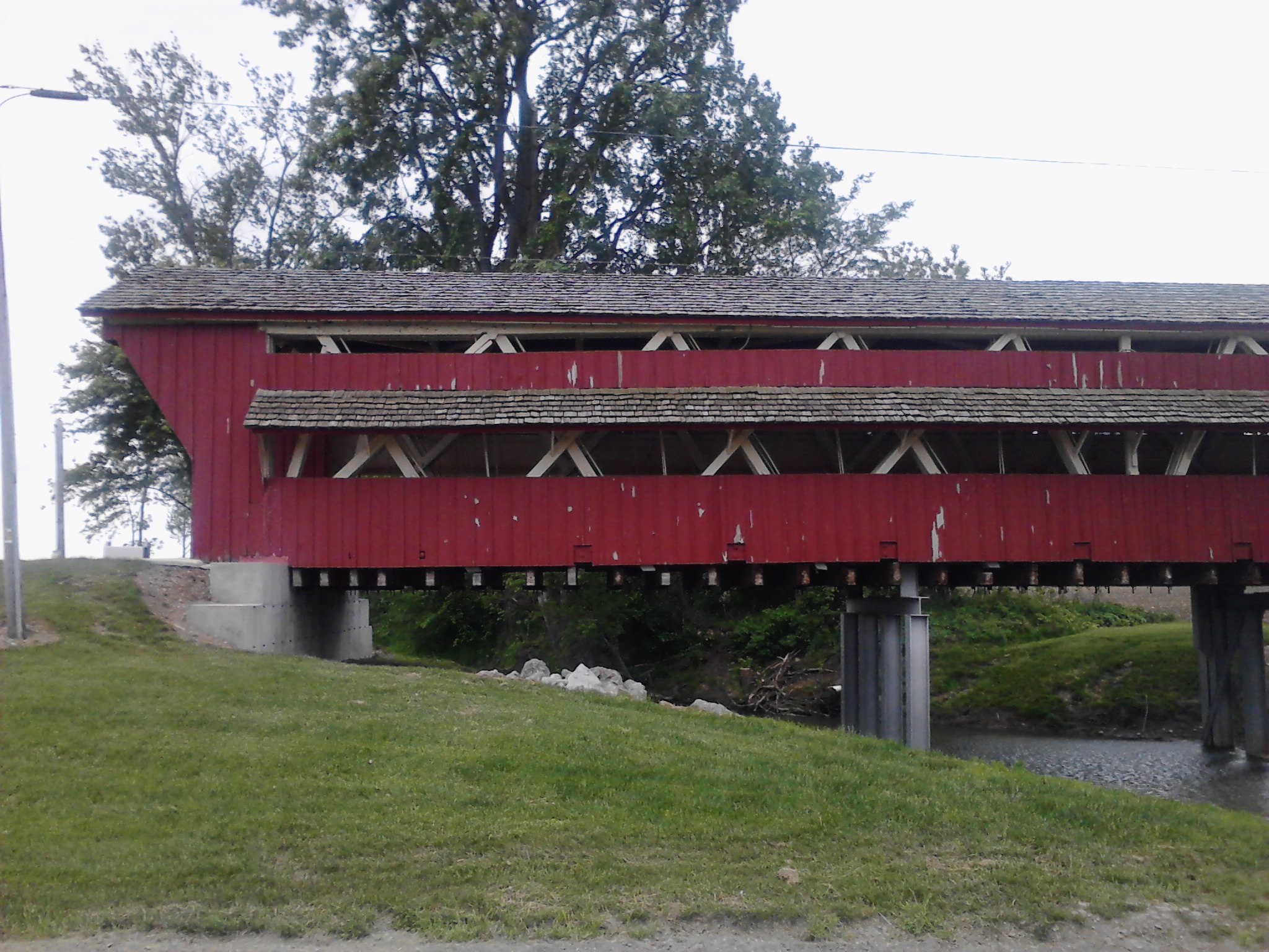 Before bridges were made of iron, steel, and concrete, they were made of wood. They created wooden truss from which the bridge was built. The problem was that a wooden bridge exposed to snow, rain, and sun, would only last ten to fifteen years. By building the bridge with sides and a roof they could extend the life of the bridge. Like I said, this one is 142 years old.