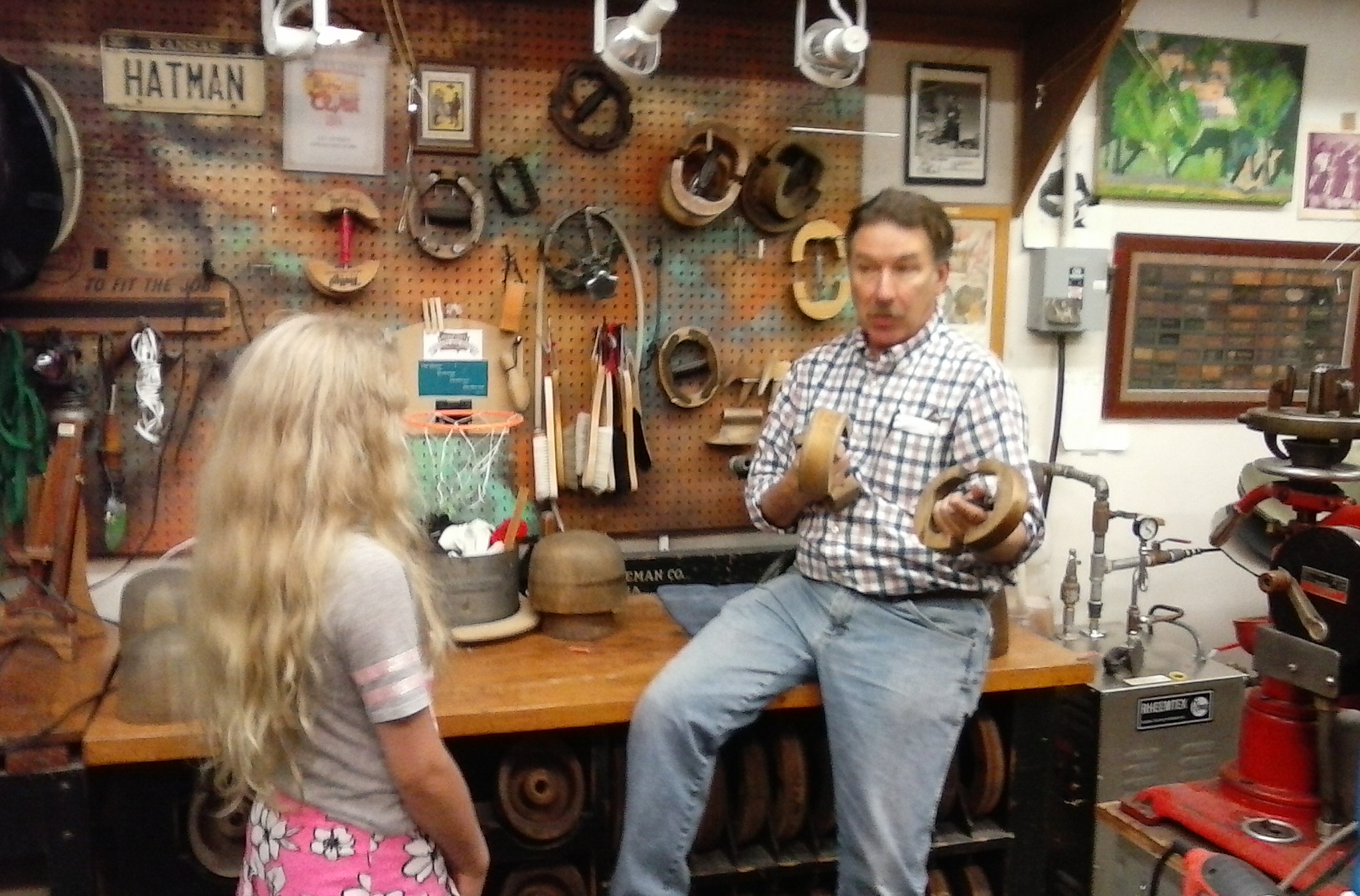 Elizabeth in the workshop at Hatman Jack’s learning about hat making from Jack.